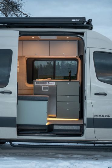 The Funner layout is geared towards FaceTime. And we don't mean on your phone! This van build is designed around the idea of gathering with its dual opposing benches. Whether its hot toddy's on a pow day or a twilight dinner for two in the Tetons, everything is Funner with company!