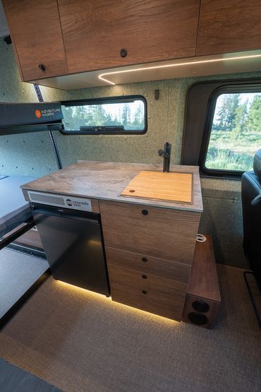 At your design meeting you'll be able to choose all of your interior finishes including the upholstery fabrics, flooring, cabinetry materials, countertop, even the hardware and accessory accent color. With thousands of possible combinations no two vans are alike and the possibilities are endless.