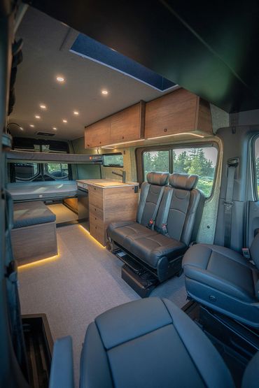 The Mt. Hood is our seat and sleep four floor plan for the 170" wheelbase that is ideal for young families gearing up for the adventure ahead. Featuring a second row of convertible swivel seating and removable, height adjustable dual bunks, this floor plan makes family getaways a breeze.